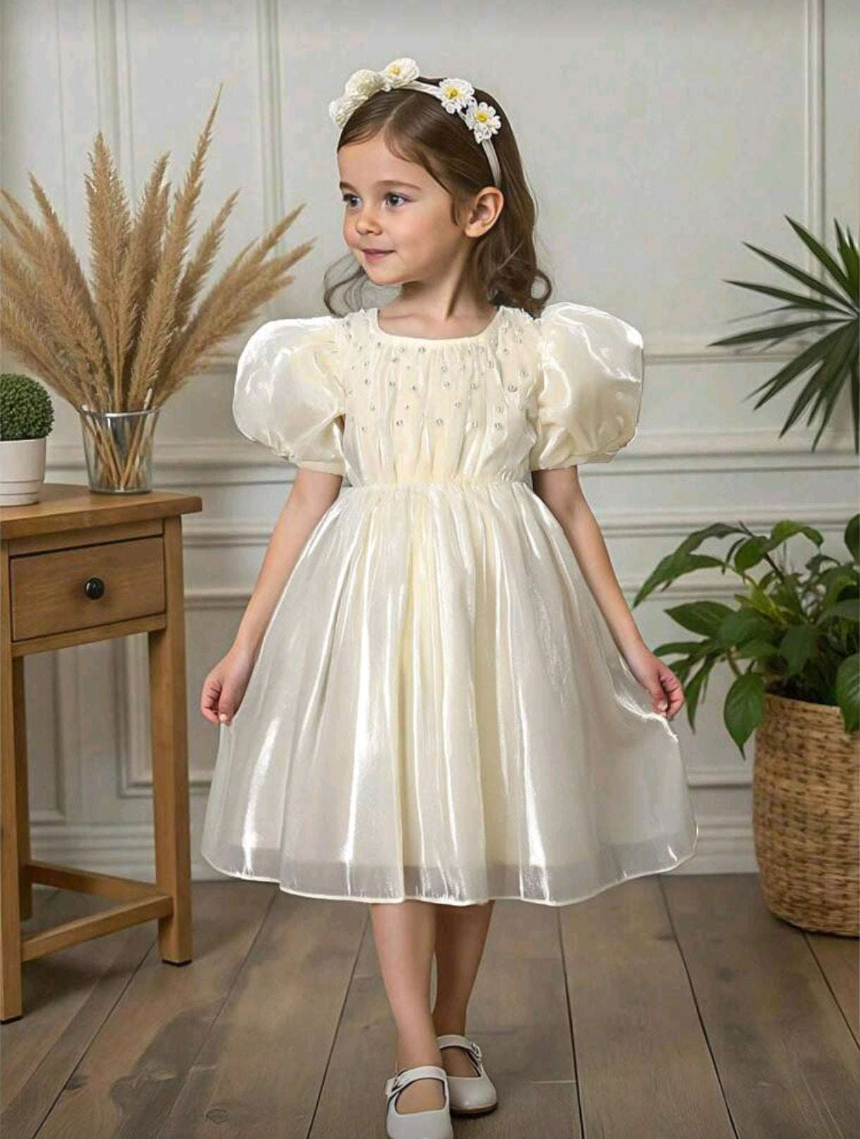 Vestido elegante de mangas abullonadas y detalles de perlitas
